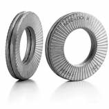 瑞典NORD-LOCK AB公司自1982年起,致力于生產一種為螺栓連接設計的優(yōu)秀的安全系統(tǒng),名字就叫NORD-LOCK[1] ,中文意思為防松墊圈。它提供了一種不會受任何振動或動力負載影響的螺栓安全鎖緊系統(tǒng),這種螺栓安全系統(tǒng)結構單一,只由具有特殊凸輪齒面并預先組合的一對墊圈構成。這種防松墊圈,由兩片相同的墊圈組成一套,每片的上、下面帶有不同鋸齒。一面為凸輪狀大齒,其斜坡角度α大于螺栓螺紋角β,另一面為較密小齒。墊圈安裝時,要大齒面相對,成對安裝。小齒面分別與螺母和被緊固件接觸。擰緊螺栓連接緊固件后,振動發(fā)生時,大齒面會錯動抬升,并由α角大于β角的原理來鎖住螺栓,使之不能松動。