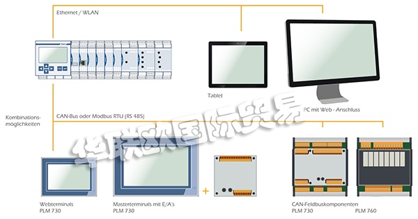 ③CAN主模塊:PLM 730 I/O現(xiàn)場(chǎng)總線模塊只能與主模塊一起運(yùn)行。與PC的以太網(wǎng)通信選項(xiàng):例如CAN/TCP/IP/UDP/FTP/OPC/Web服務(wù)器/Modbus RTU/Modbus TCP/RS 232/RS 485與Tablet PC通過WLAN的通信選項(xiàng)。