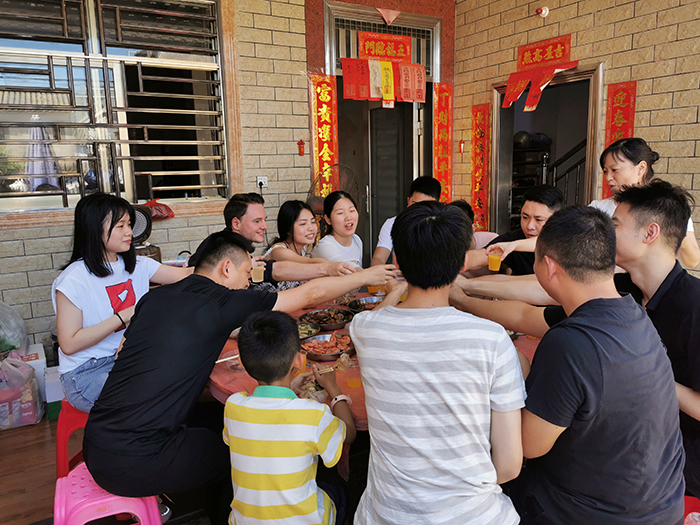 中午,我們進(jìn)住民宿。安頓好行李后,我們共進(jìn)午餐,感覺到生活的新鮮與愜意。豐盛的佳肴,濃香的美酒,讓我們沉浸在歡樂(lè)的氣氛中,享受著工作勞頓后帶來(lái)的無(wú)比快樂(lè)。舉杯,道聲辛苦了;舉杯,互致祝福。品生活芳香,享生活甘甜。團(tuán)隊(duì)人不光在工作中有拼勁,而且在酒桌上也毫不含糊,舉杯,一飲而盡。