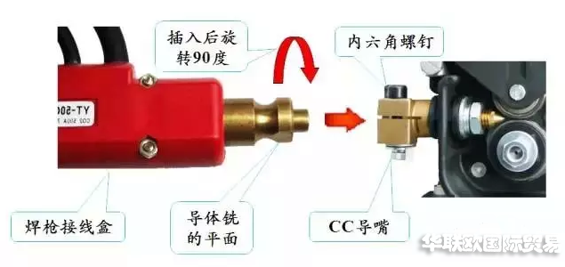 將BINZEL焊槍接線盒銅導體銑的平面處對準CC導嘴的內(nèi)六角螺釘推入,再將接線盒旋轉(zhuǎn)90度后擰緊內(nèi)六角螺釘。