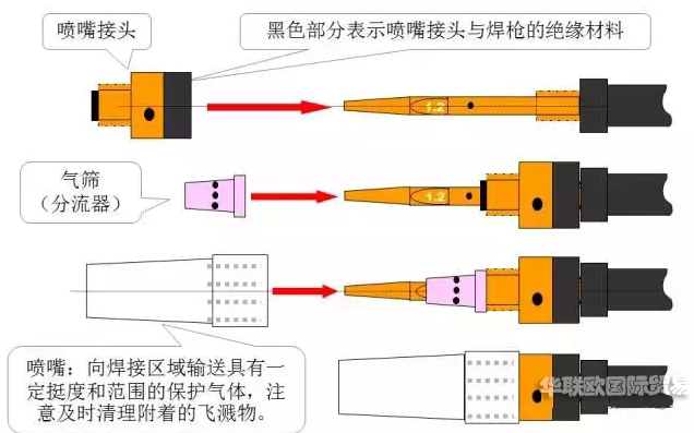 導電嘴與噴嘴應(yīng)保持良好的絕緣狀態(tài),氣篩除可使保護氣體分布更均勻,保護效果更好外,還可加大導電嘴與噴嘴之間的絕緣距離。焊接時應(yīng)使用防堵劑并及時清理噴嘴內(nèi)的飛濺物,使用防堵劑應(yīng)注意不要流淌到氣篩上,以免堵塞氣篩的氣孔,影響保護效果導致焊縫出現(xiàn)氣孔。