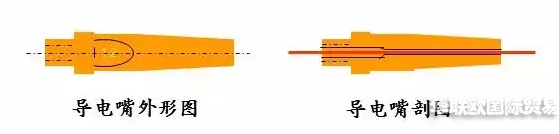 導電嘴是直接向焊絲傳遞電流的零件, 導電嘴內(nèi)孔與焊絲接觸而導電, 導電嘴外表面與噴嘴內(nèi)壁之間流過保護氣體。