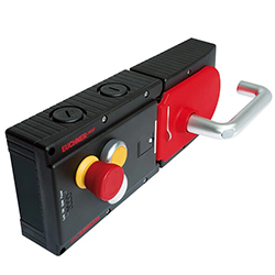 鎖止模塊檢測到安全防護裝置和鎖舌的位置。對于MGB-L1以及MGB-L2,門是否上鎖也同樣可以被監(jiān)控到。與MGB-L0相似,通過旋轉(zhuǎn)手柄,可以使安全鎖舌進入或是推出鎖止模塊。當(dāng)安全鎖舌完全進入鎖止模塊,安全鎖勾將鎖舌鎖止。但是鎖止可能是通過彈簧彈力或是電磁線圈磁力作用實現(xiàn),這取決于型號是MGB-L1還是MGB-L2,兩者的鎖止方式不同。