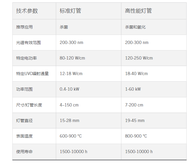 5、德國(guó)HERAEUS紫外線燈管技術(shù)參數(shù)對(duì)比