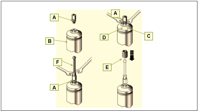 5、插入保持器(E): 沿著測桿插入保持器,直到它越過保護銷(A)