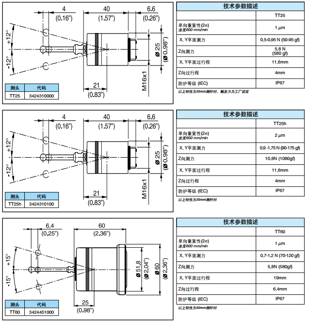 MARPOSS側(cè)頭TT系列測頭分為TT25、TT25h、TT60三類,TT25h測頭是大觸發(fā)力的TT25產(chǎn)品,允許使用