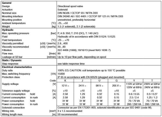NG06方向控制閥D1VW系列可提供高功能限制80l/分鐘,節(jié)能降壓。各種各樣的閥芯選項(xiàng)允許設(shè)計(jì)液壓回路的數(shù)量不受限制,使用8瓦特線圈,經(jīng)過ATEX認(rèn)證,該閥也可作為夾層式。
